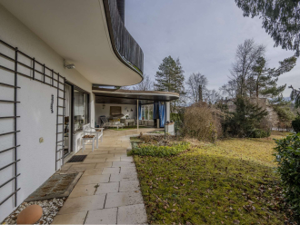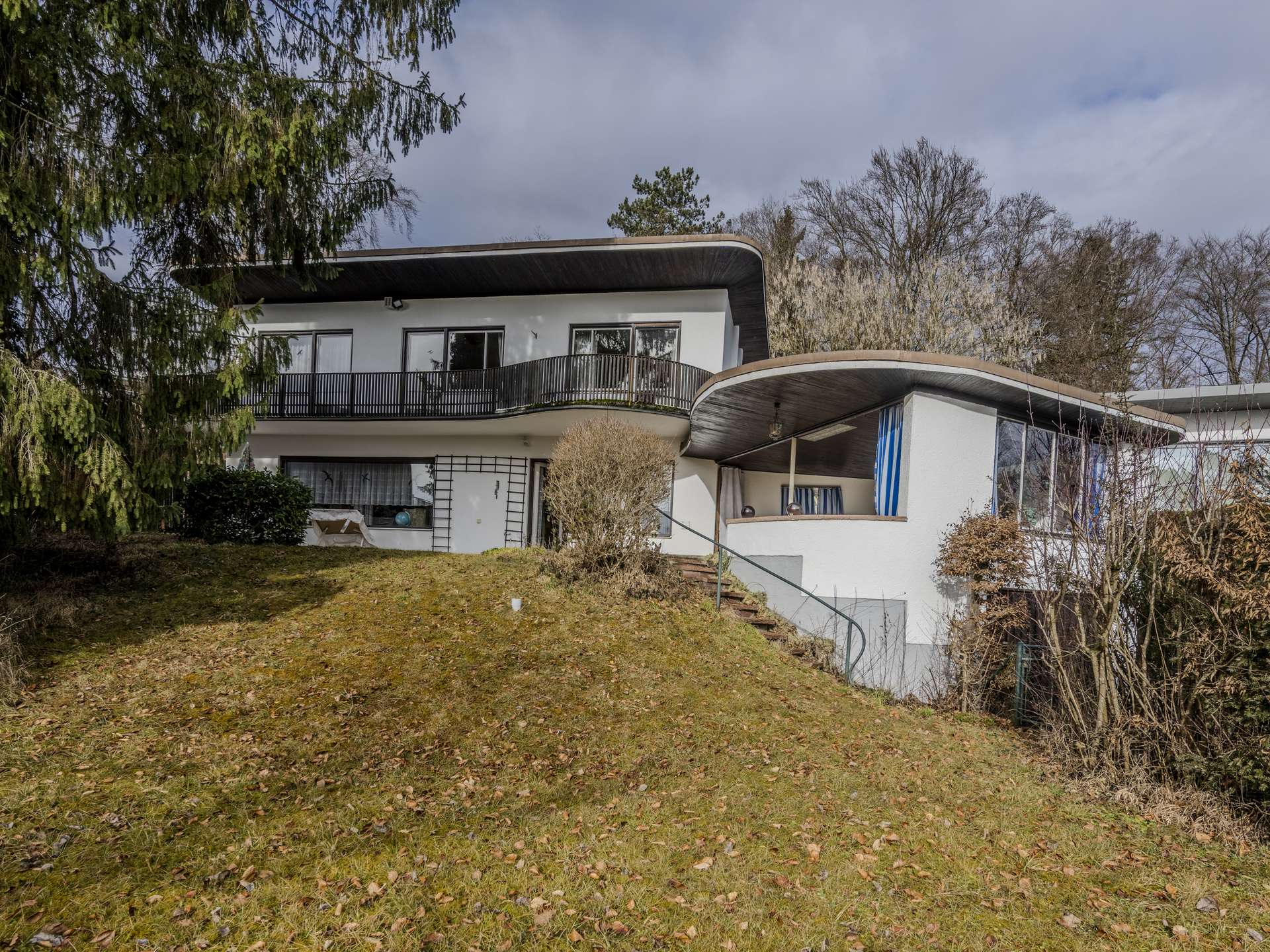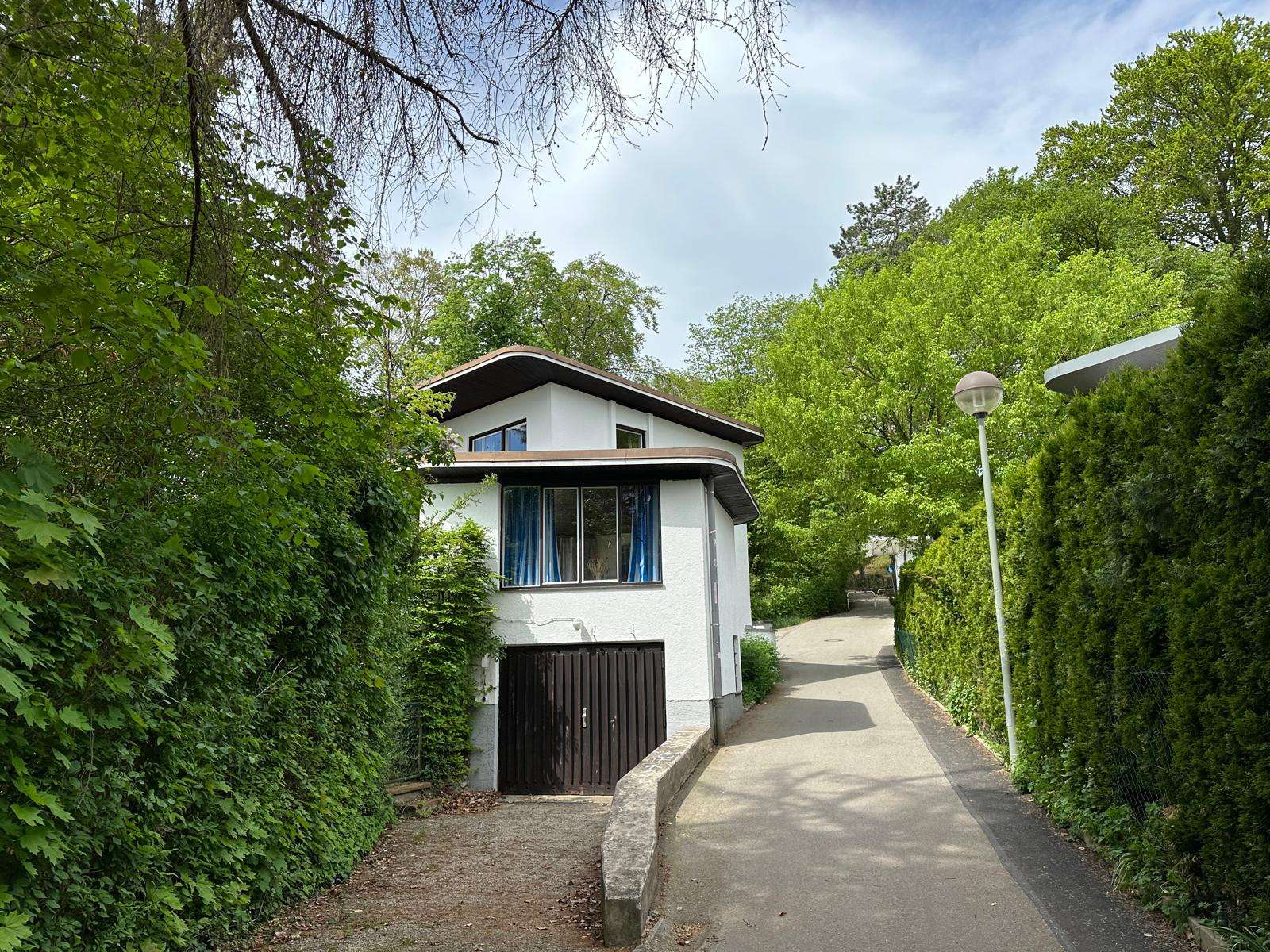 Die geschützte Lage am Hang, kombiniert mit den großzügigen Fensterflächen und Terrassen, schafft eine helle, offene Wohnatmosphäre mit Blick in den eingewachsenen Garten.