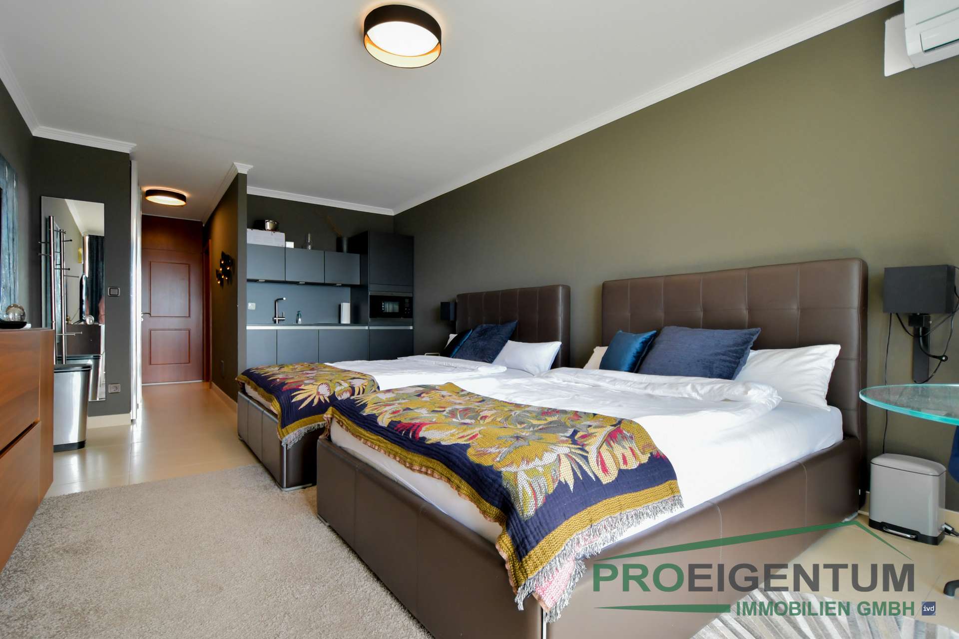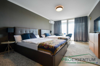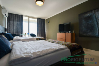 Neben einer modernen anthrazitfarbenen Küchenzeile gehören auch zwei Doppelbetten, Kleiderschränke, Fernseher, Tische sowie vollständiges Geschirr und Küchenutensilien zur Ausstattung. Damit entfällt jeglicher zusätzlicher Aufwand – ein klarer Vorteil für Kapitalanleger, die von einer sofortigen Vermietbarkeit profitieren möchten.
