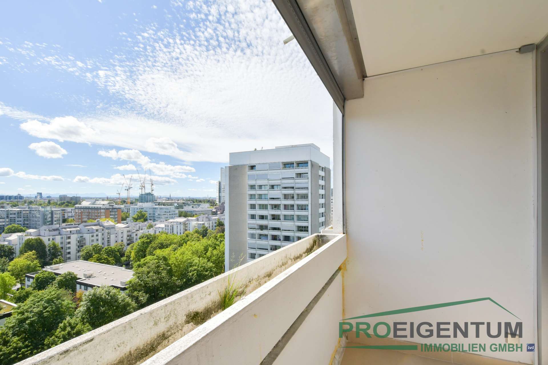 Das Highlight ist die Südloggia, die den Wohnraum erweitert und einen atemberaubenden Panoramablick über die Münchner Skyline bis hin zur Alpenkette eröffnet. Die großzügige Fensterfront sorgt für Helligkeit und eine freundliche Wohnatmosphäre. Eine Außenjalousie ermöglicht die Verdunkelung zum erholsamen Schlaf.