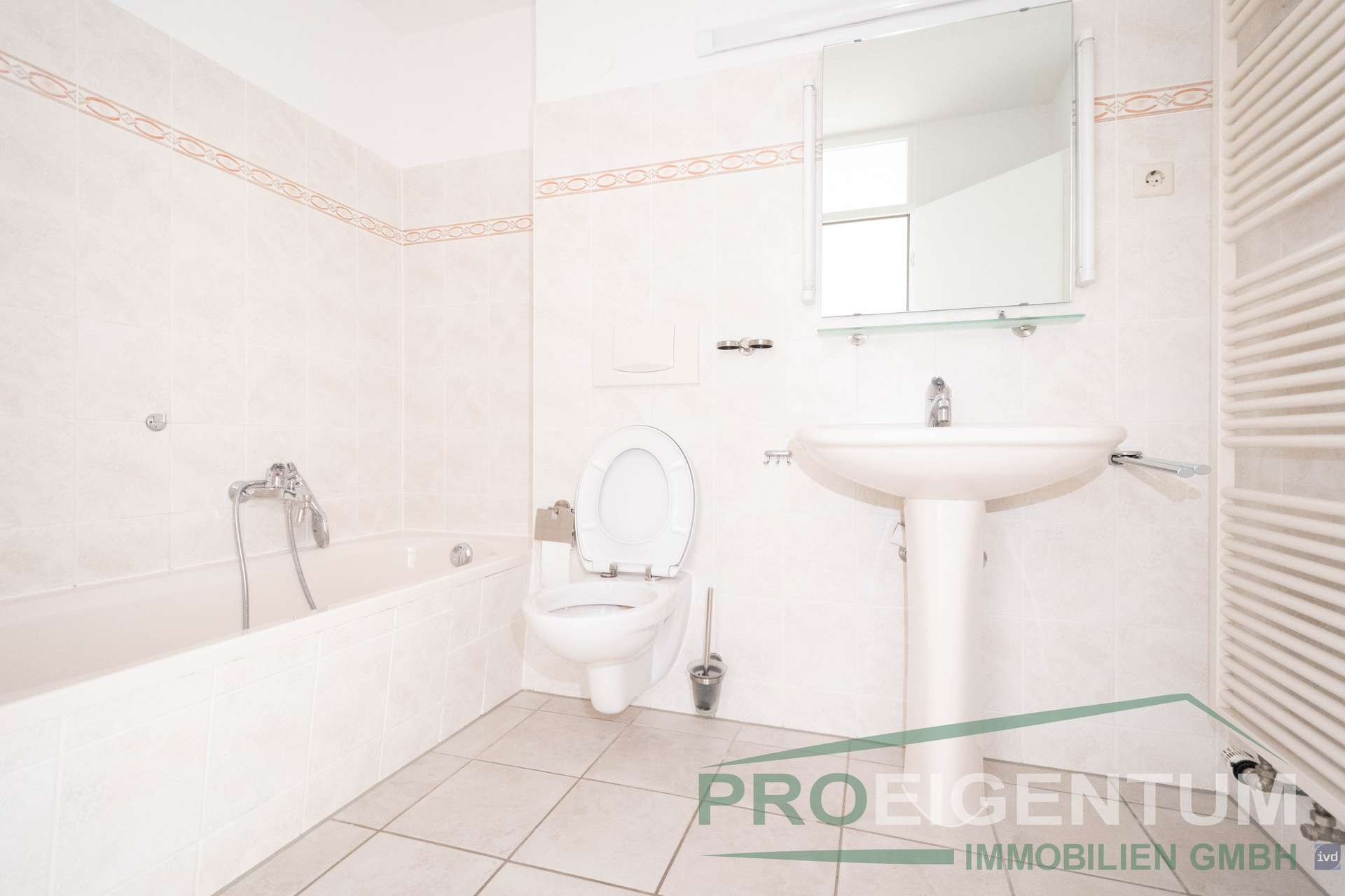 Die helle Küche mit Fenster bietet angenehmes Tageslicht und kurze Wege. Das Badezimmer ist hell gefliest und mit einer Badewanne ausgestattet. Ein separates Gäste-WC sorgt für zusätzlichen Komfort im Alltag.