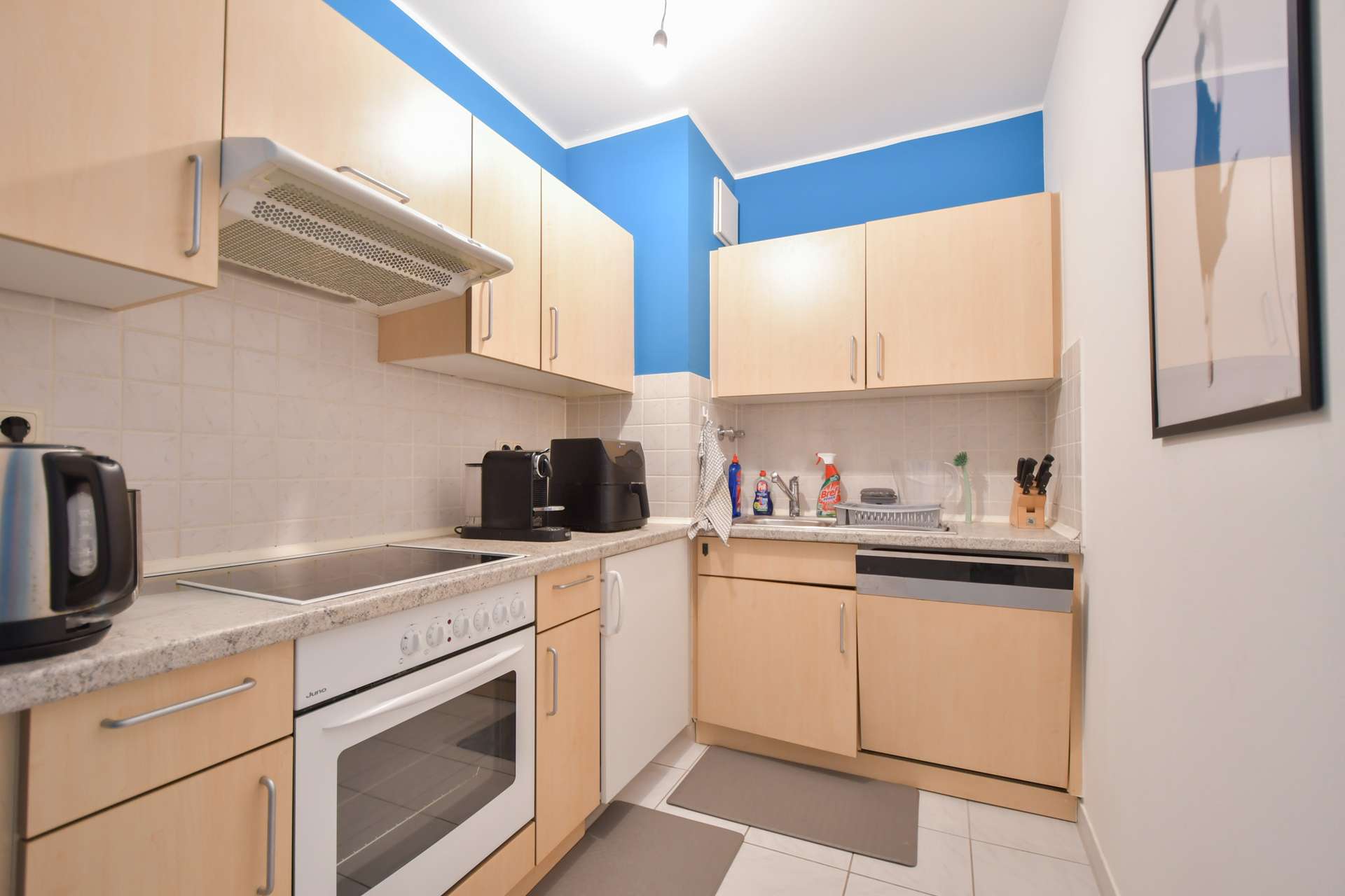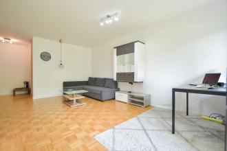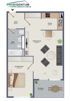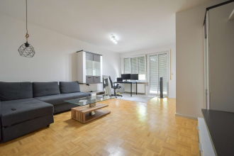 Die Wohnung selbst besticht durch ihren klaren Grundriss: Ein großzügiges Wohnzimmer mit offener Küche bildet das Herzstück des Zuhauses. Dank der Südausrichtung sind alle Räume lichtdurchflutet und bieten ein freundliches Wohnambiente.