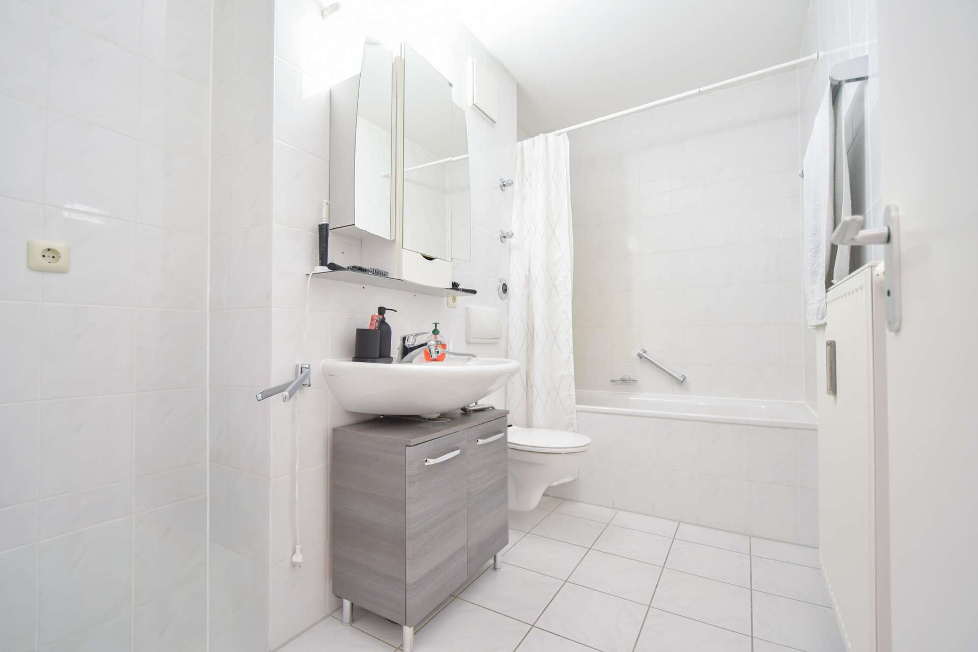 Das Badezimmer ist deckenhoch in Weiß gefliest, großzügig geschnitten und verfügt über einen praktischen Waschmaschinenanschluss.